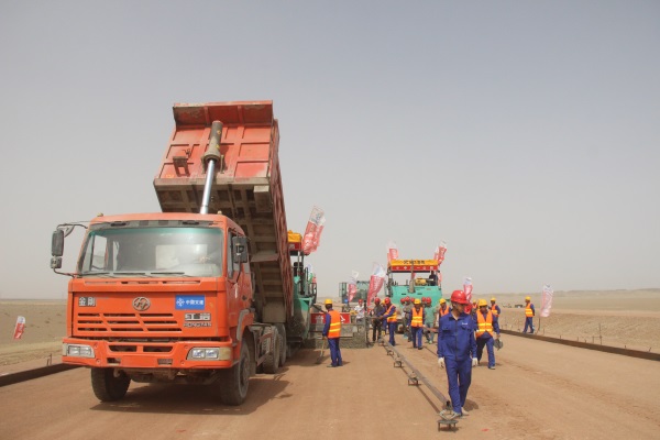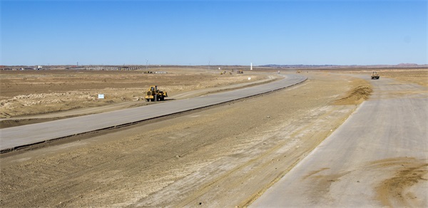 主線面層厚16cm,即4cmAC-16型中粒式改性瀝青混凝土上面層、5cmAC-20型中粒式改性瀝青混凝土中面層、7cmAC-25型粗粒式瀝青混凝土下面層。吉蘭泰連接線面層厚10cm,即4cmAC-16型中粒式改性瀝青混凝土上面層、6cmAC-20型中粒式改性瀝青混凝土下面層;烏力吉口岸連接線面層采用5cmAC-16型中粒式改性瀝青混凝土。